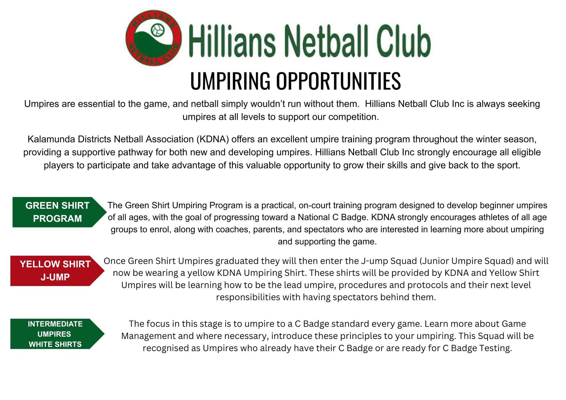 Kalamunda Districts Netball Association for more information about their umpiring programs.