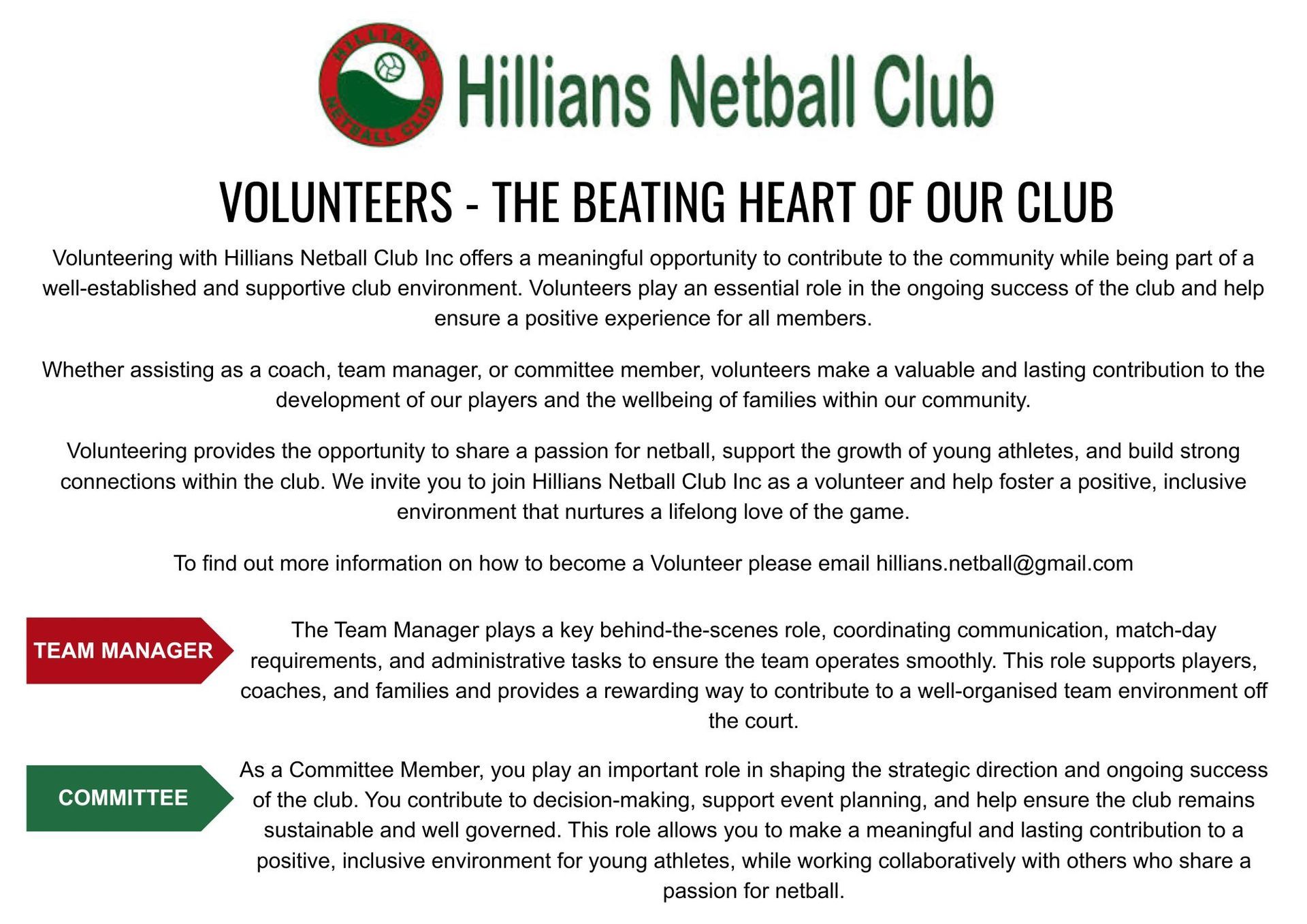 By joining the Hillians Netball Club Inc Committee, you are helping shape the future of our club and making a real difference in the lives of our children. Our Committee is made up of passionate parents and volunteers who work together to create a fun, safe, and supportive environment for all players.